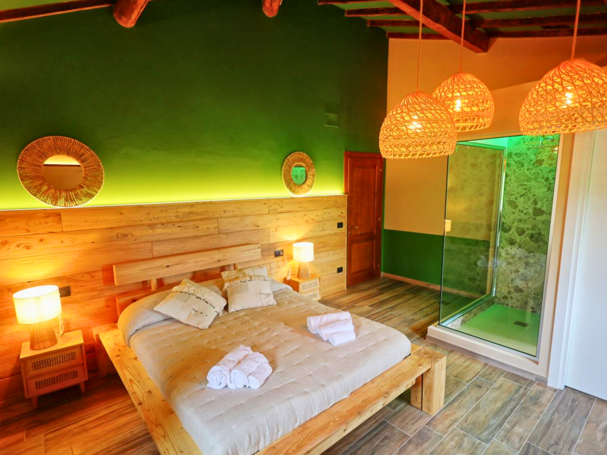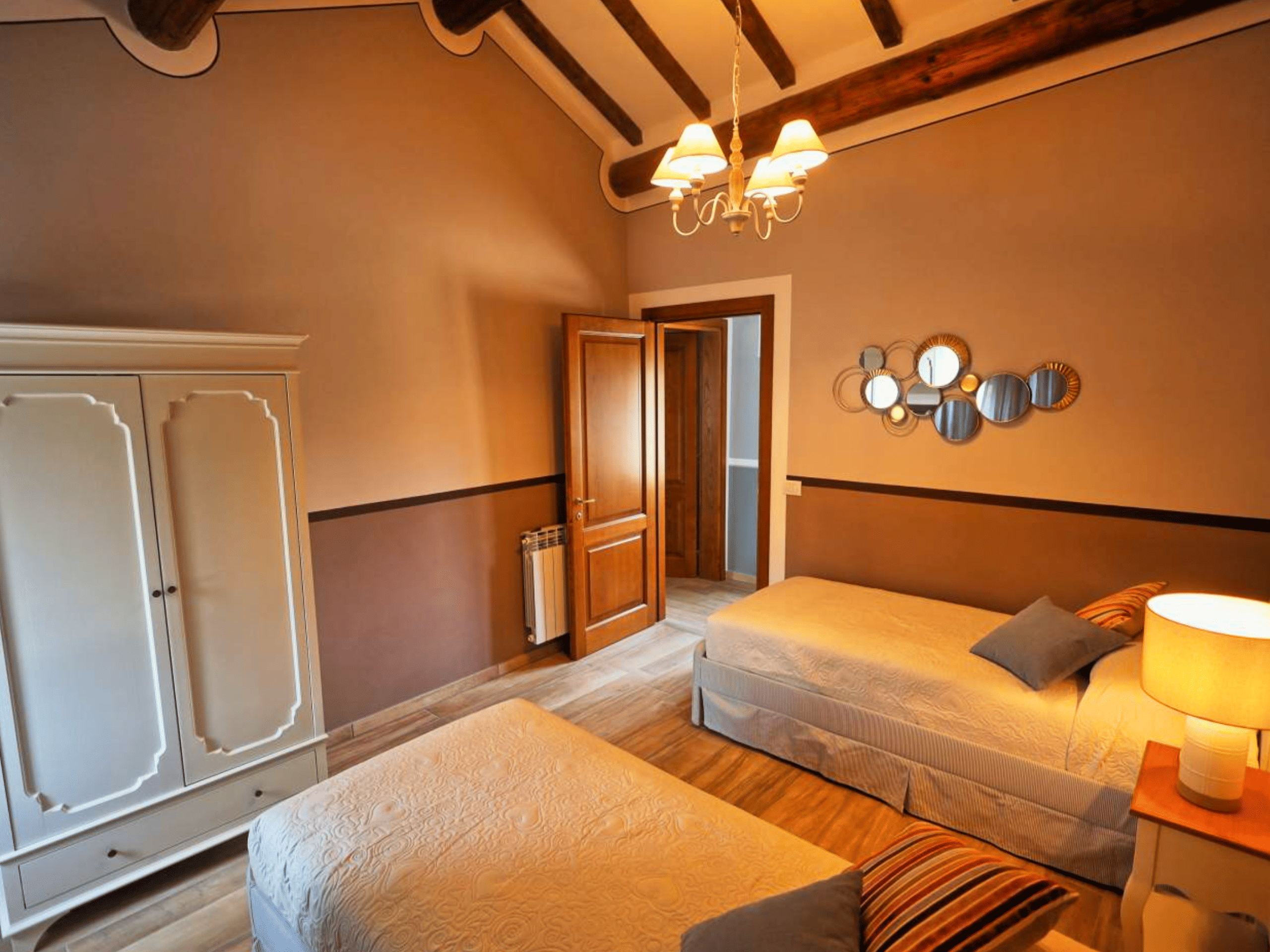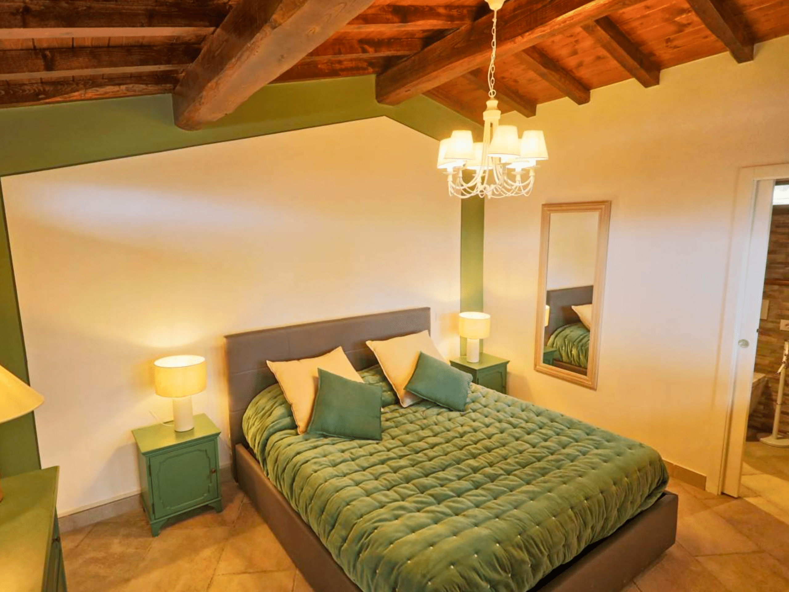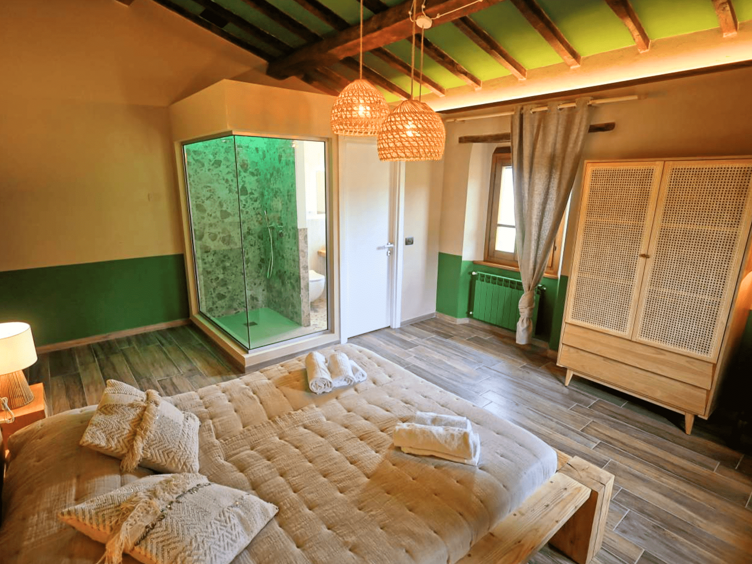 Op de eerste verdieping vind je een ruime kamer met een tweepersoons- en een eenpersoonsbed. De kamer is stijlvol ingericht en beschikt over een eigen badkamer, voorzien van airconditioning, luxe doucheartikelen en zachte handdoeken. Een comfortabele plek om helemaal tot rust te komen.