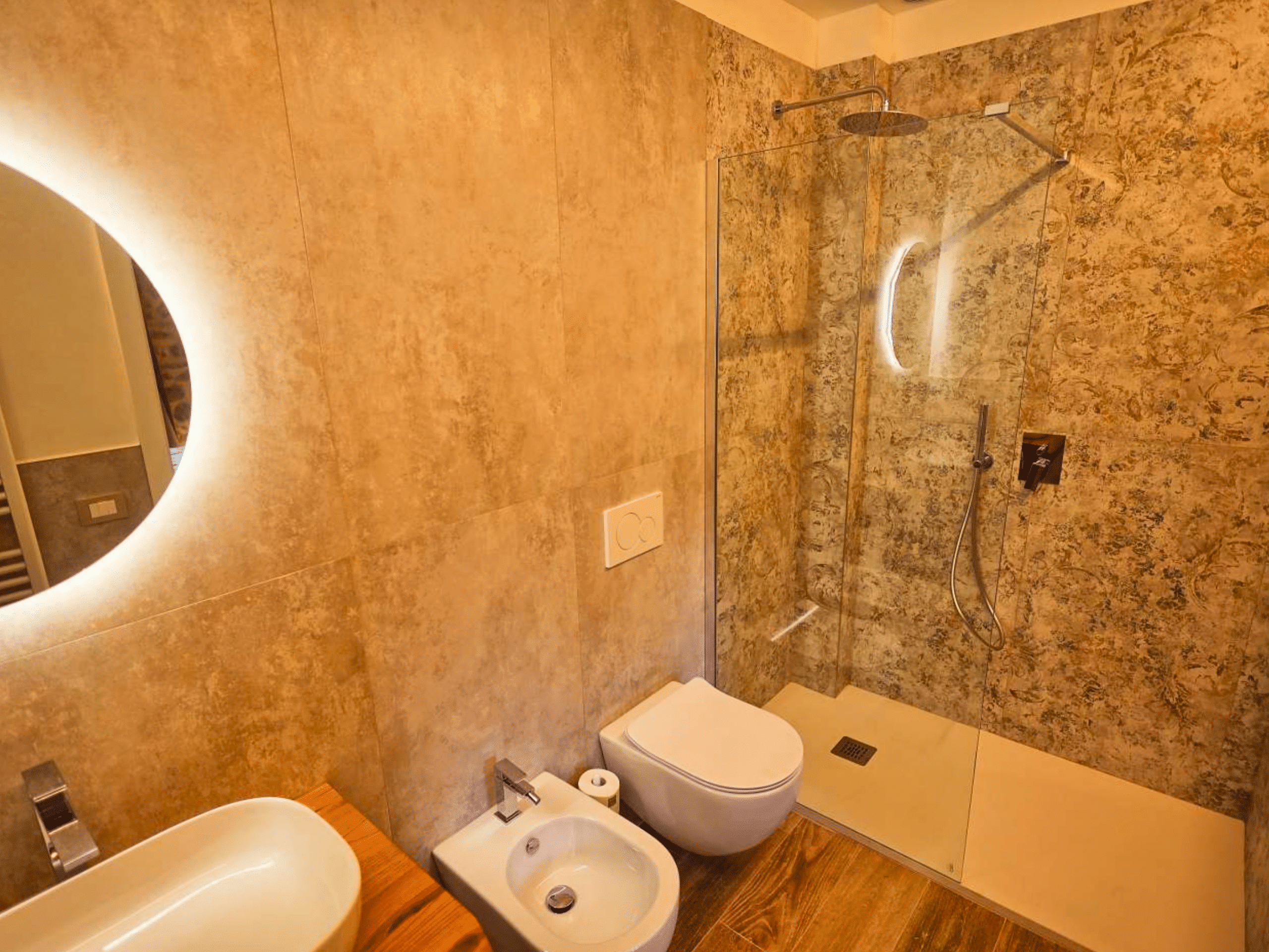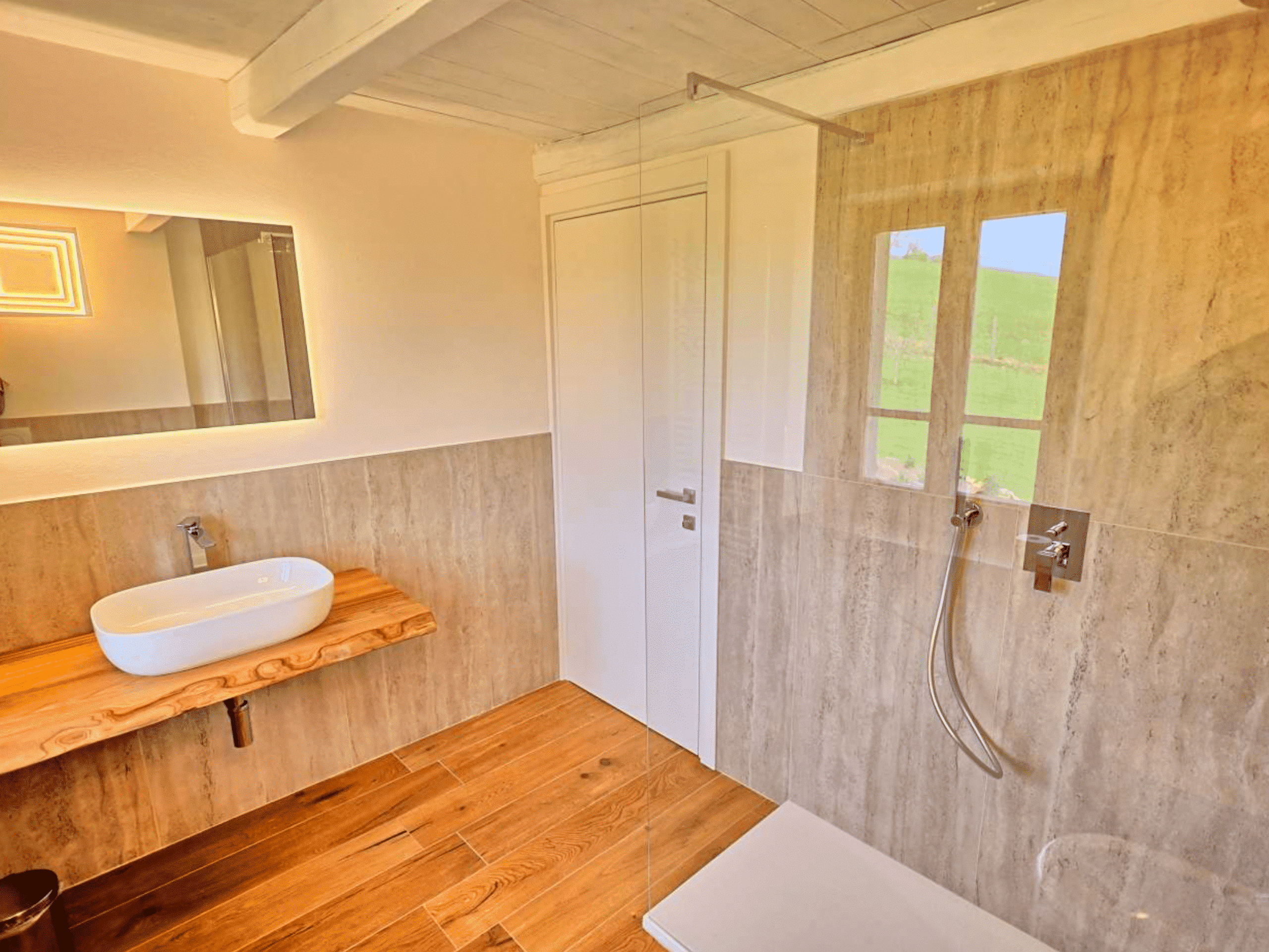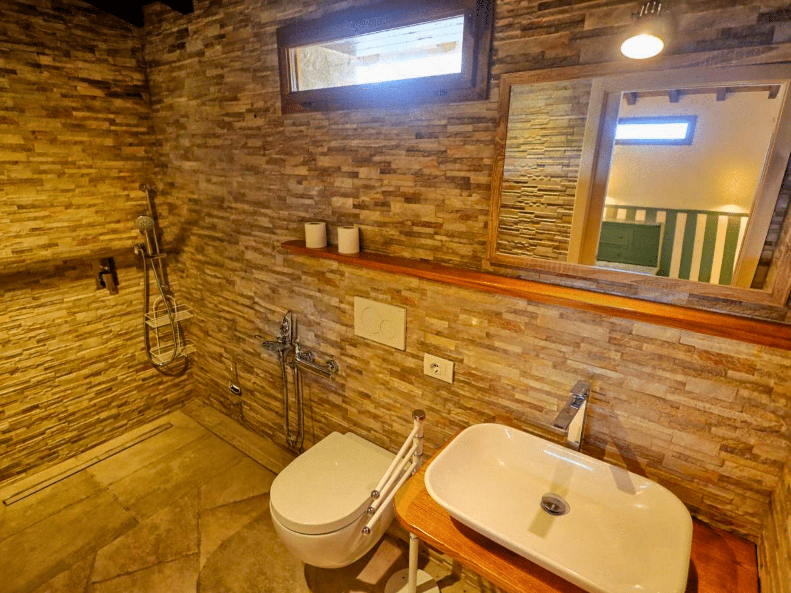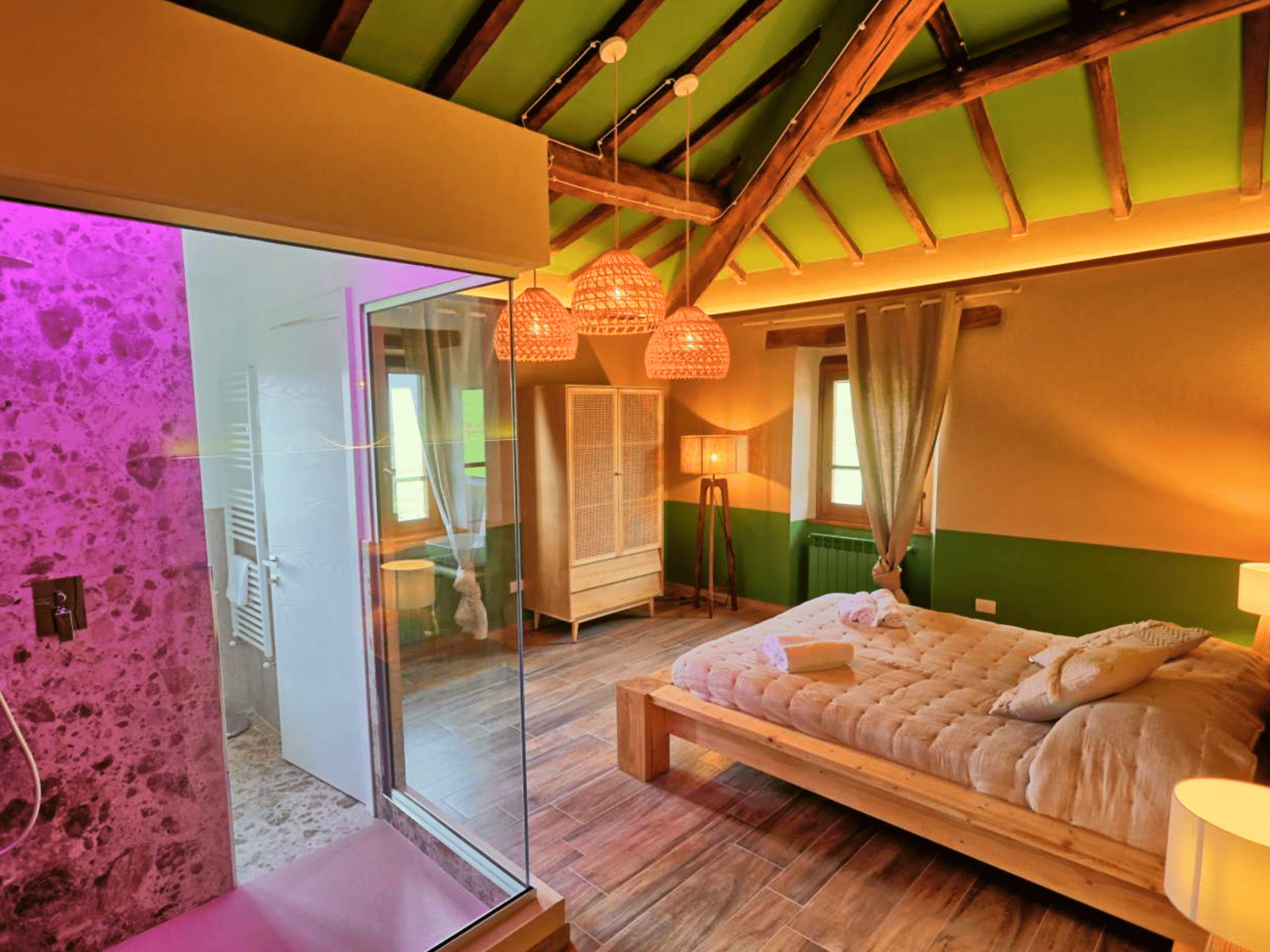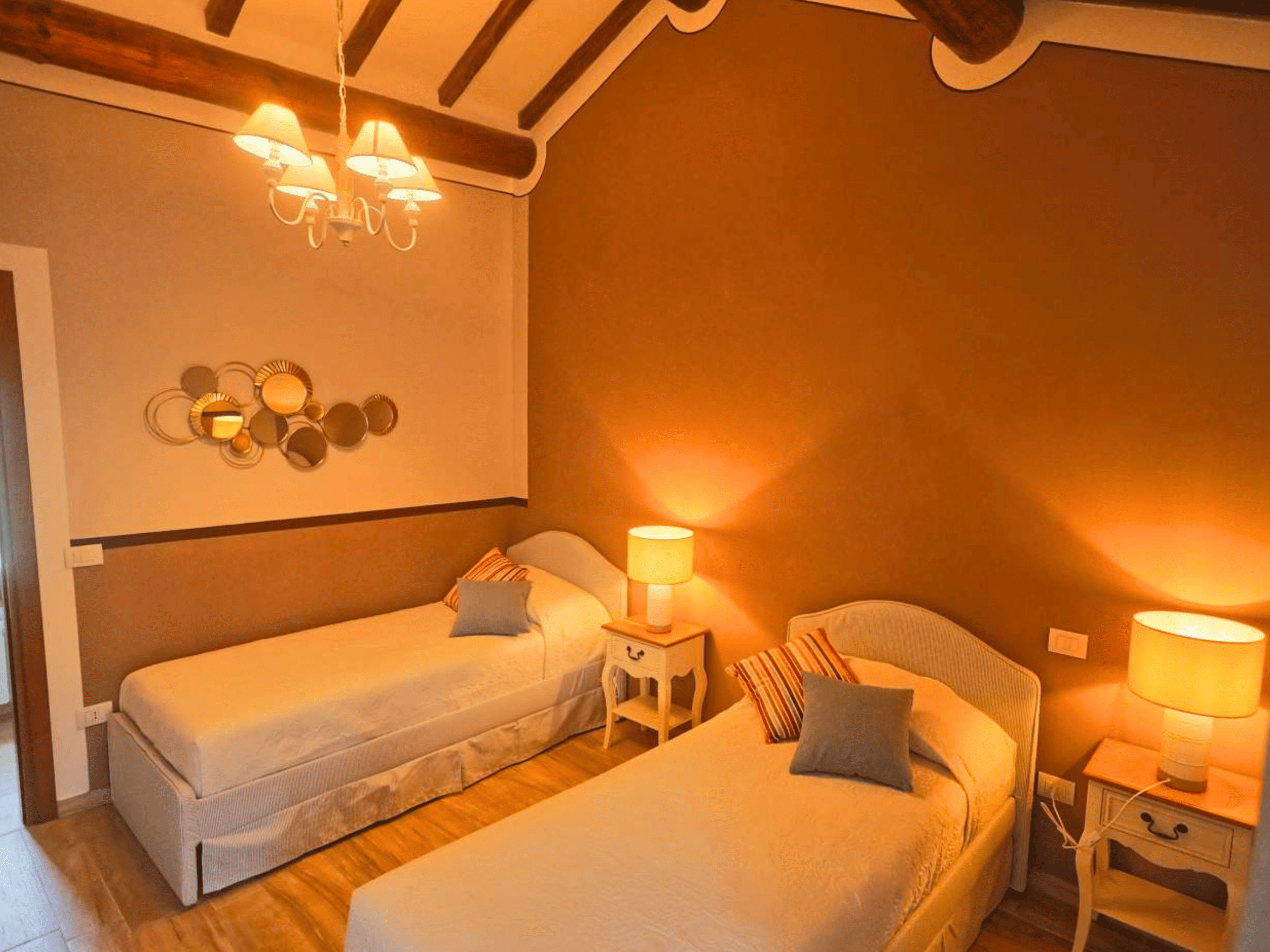 Op de eerste verdieping vind je een ruime kamer met een tweepersoons- en een eenpersoonsbed. De kamer is stijlvol ingericht en beschikt over een eigen badkamer, voorzien van airconditioning, luxe doucheartikelen en zachte handdoeken. Een comfortabele plek om helemaal tot rust te komen.
